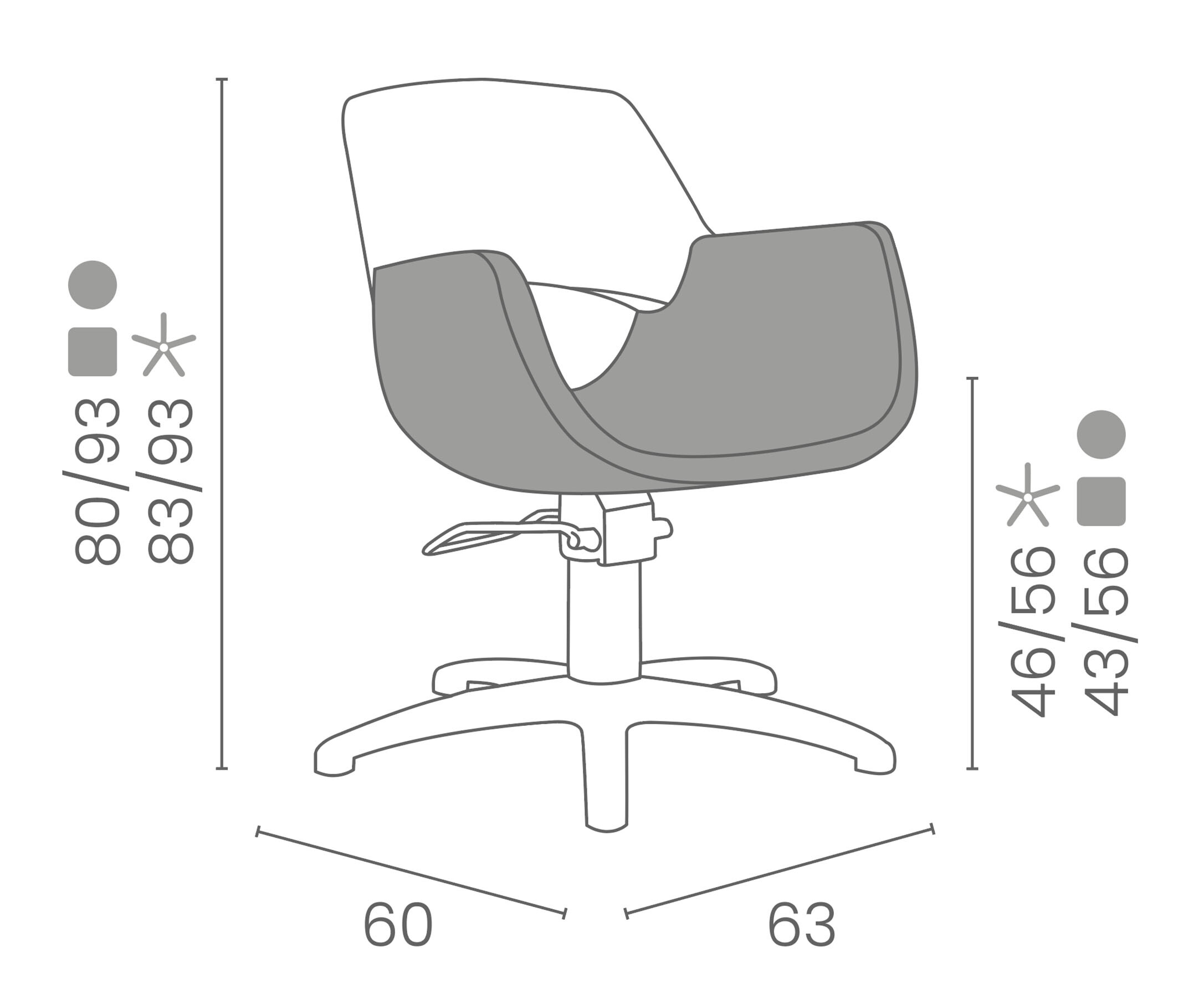 Tutte le poltrone Luca Rossini sono disponibili con pompa con freno e base a stella, tonda o quadrata.